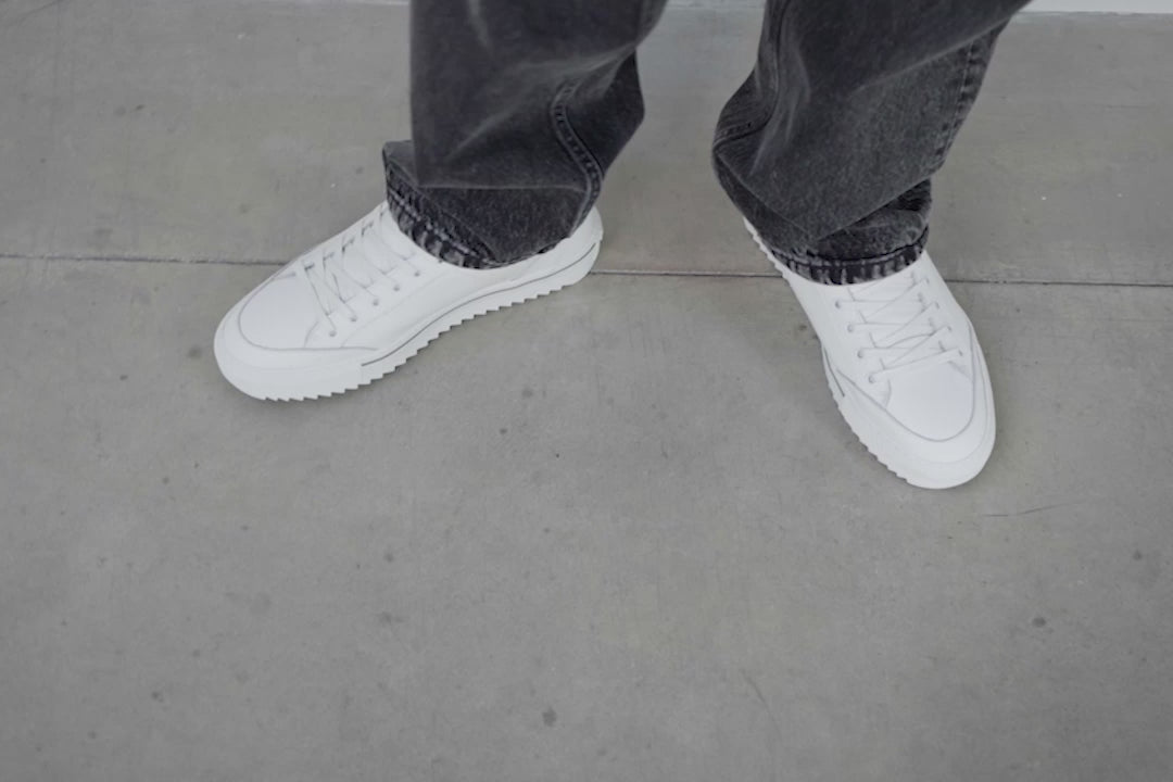 Wit-khaki sneaker van leer met katoenen veters en stevige rubberzool. Fris, clean en sportief – combineer moeiteloos met jeans of chino.